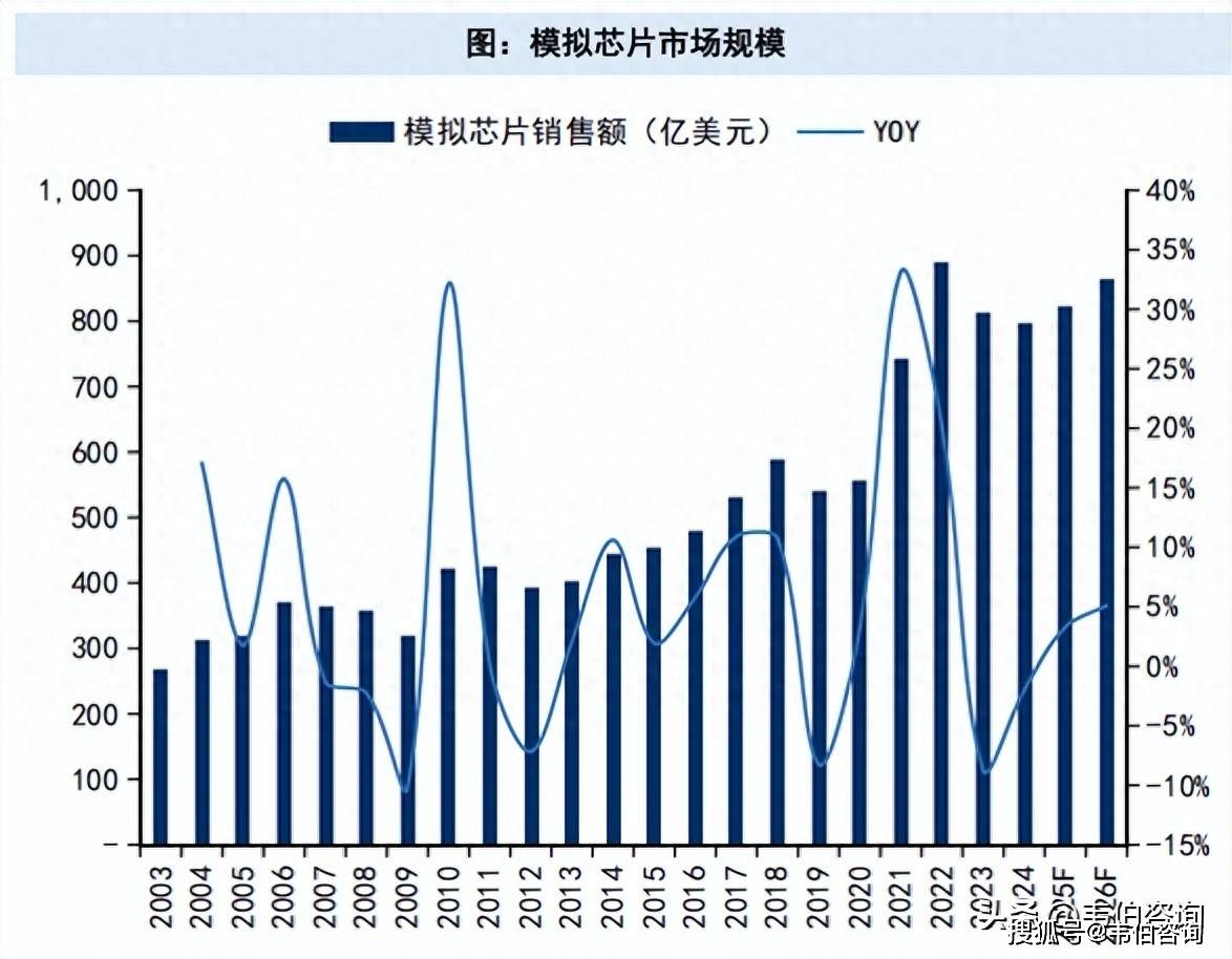 2024年全球模拟芯片市场规模减少2.0%,2025/2026年恢复增长。根据WSTS的预测,2024年全球半导体销售额同比增长19.7%至6305亿美元,其中模拟芯片减少2.0%至796亿美元;2025/2026年半导体销售额继续增长15.4%和9.9%,其中模拟芯片分别增长3.3%/5.1%至822/864亿美元。