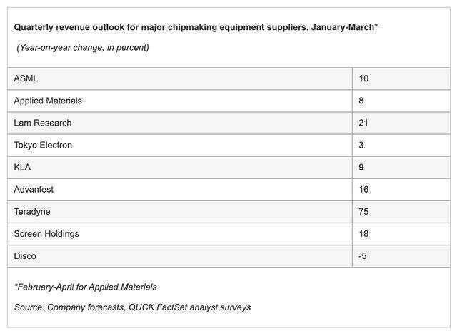 根据公司指引和QUICK FactSet分析师调查,总部位于日本、美国和欧洲的九家芯片刀具供应商的季度总营收预计将同比增长16%。除应用材料公司(Applied Materials)外,所有公司的预测均涵盖1月至3月季度;应用材料公司的预测则涵盖2月至4月季度。